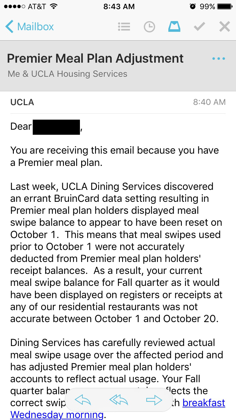 The email to students with Premier meal plans said UCLA Housing officials recently discovered the BruinCard system erroneously reset students’ swipe counts on Oct. 1. After the reset, students with the 14 Premier meal plan had 154 swipes, and those with the 19 Premier plan had 209 swipes.
