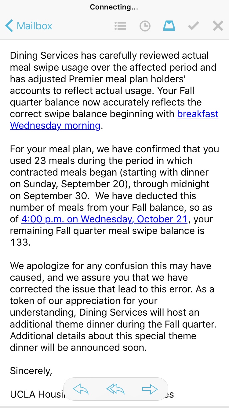 Hundreds of students woke up Wednesday morning to an email from UCLA Housing & Hospitality Services that said their number of remaining meal plan swipes was lowered, following an internal error that artificially raised students’ swipe counts at the start of the month.