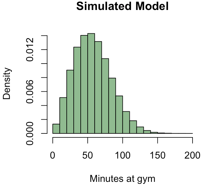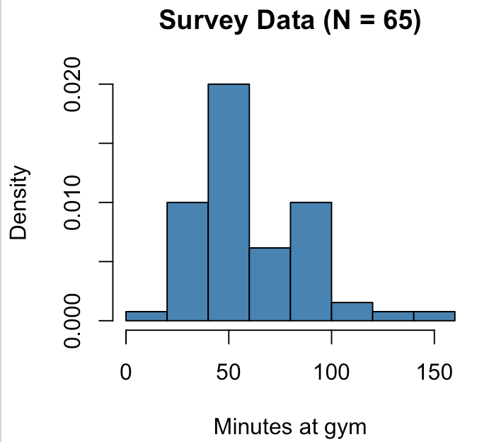 Since the dataset doesn’t have exit time stamps, we have to guess how long each workout lasted – we need to find a distribution and good enough parameters using survey data. Sixty-five UCLA students responded to an online survey asking them how long they spent at the gym the last time they went. The Weibull distribution was chosen because of its suitability for modeling timed events, and parameters were then inferred from the survey data.